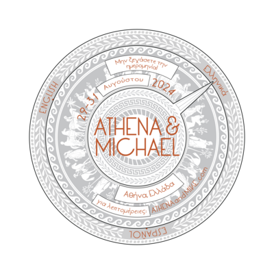 For this event, Sam envisioned a layered spinning card, allowing guests to read the event details in Greek, Spanish, and English without cluttering the design. She selected deep, textural letterpress printing on extra-thick cotton cardstock to evoke to the sculptural textures of the Parthenon.